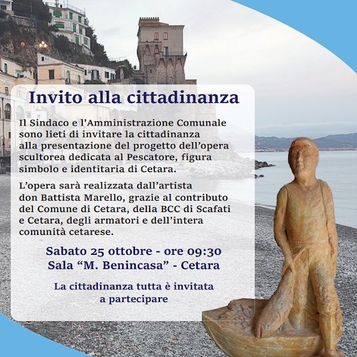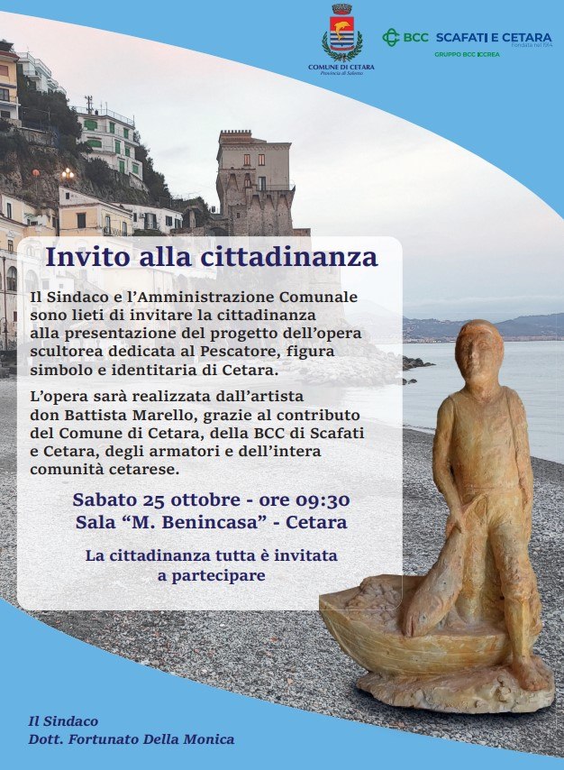 Il Comune di Cetara, in collaborazione con la BCC di Scafati e Cetara, presenta con orgoglio il progetto di una nuova opera scultorea dedicata a una figura profondamente simbolica per la comunità: il Pescatore, ossia il legame indissolubile tra la gente di Cetara e il mare.