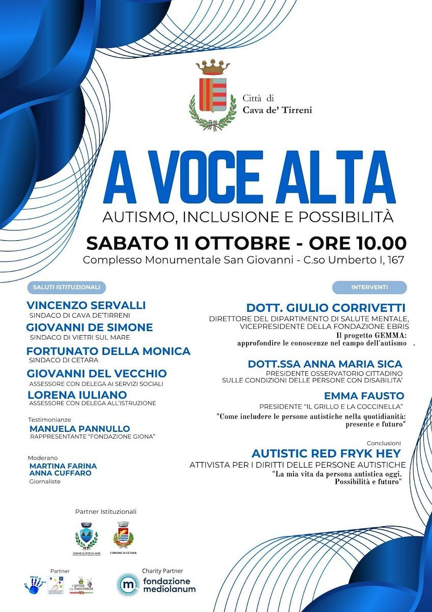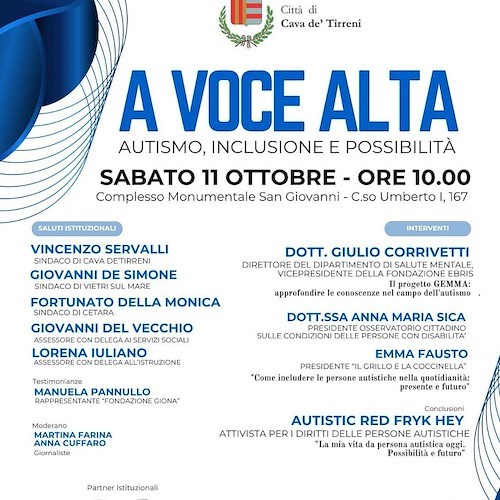 Stamattina, sabato 11 ottobre, alle ore 10.00, il Complesso Monumentale San Giovanni di Cava de' Tirreni ospiterà l'incontro "A Voce Alta - Autismo, Inclusione e Possibilità", un momento di riflessione e confronto dedicato al tema dell'autismo e alle prospettive di inclusione sociale.